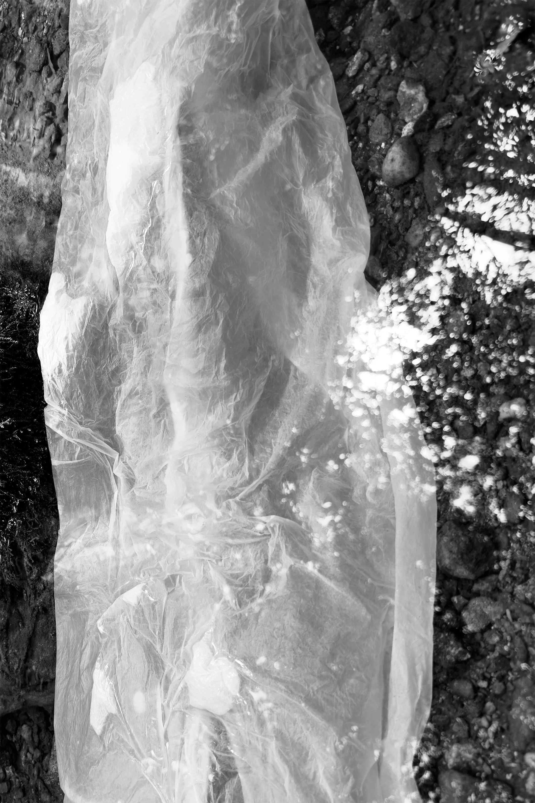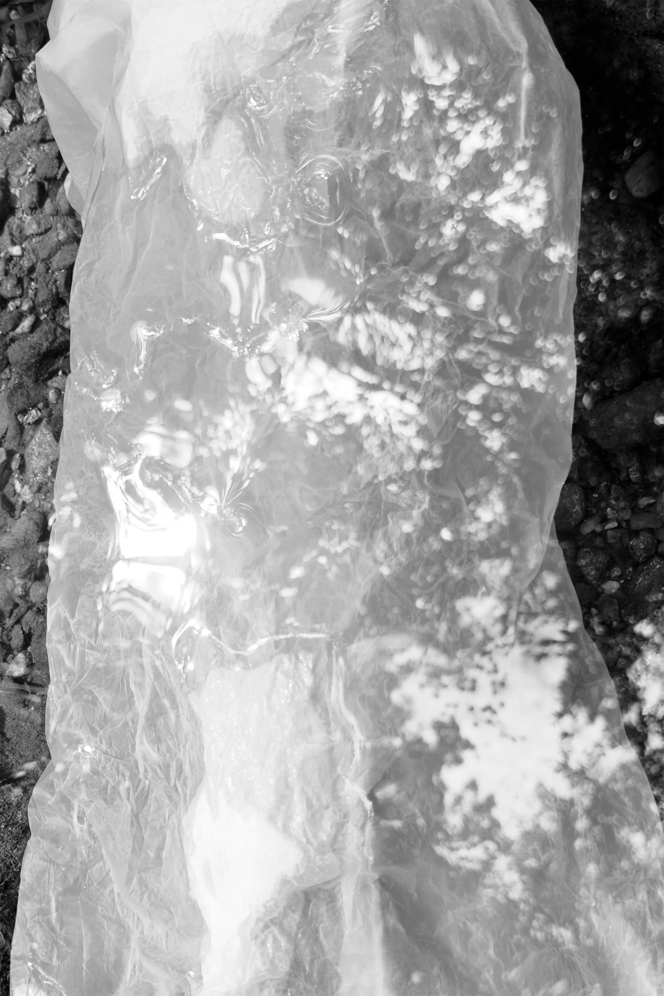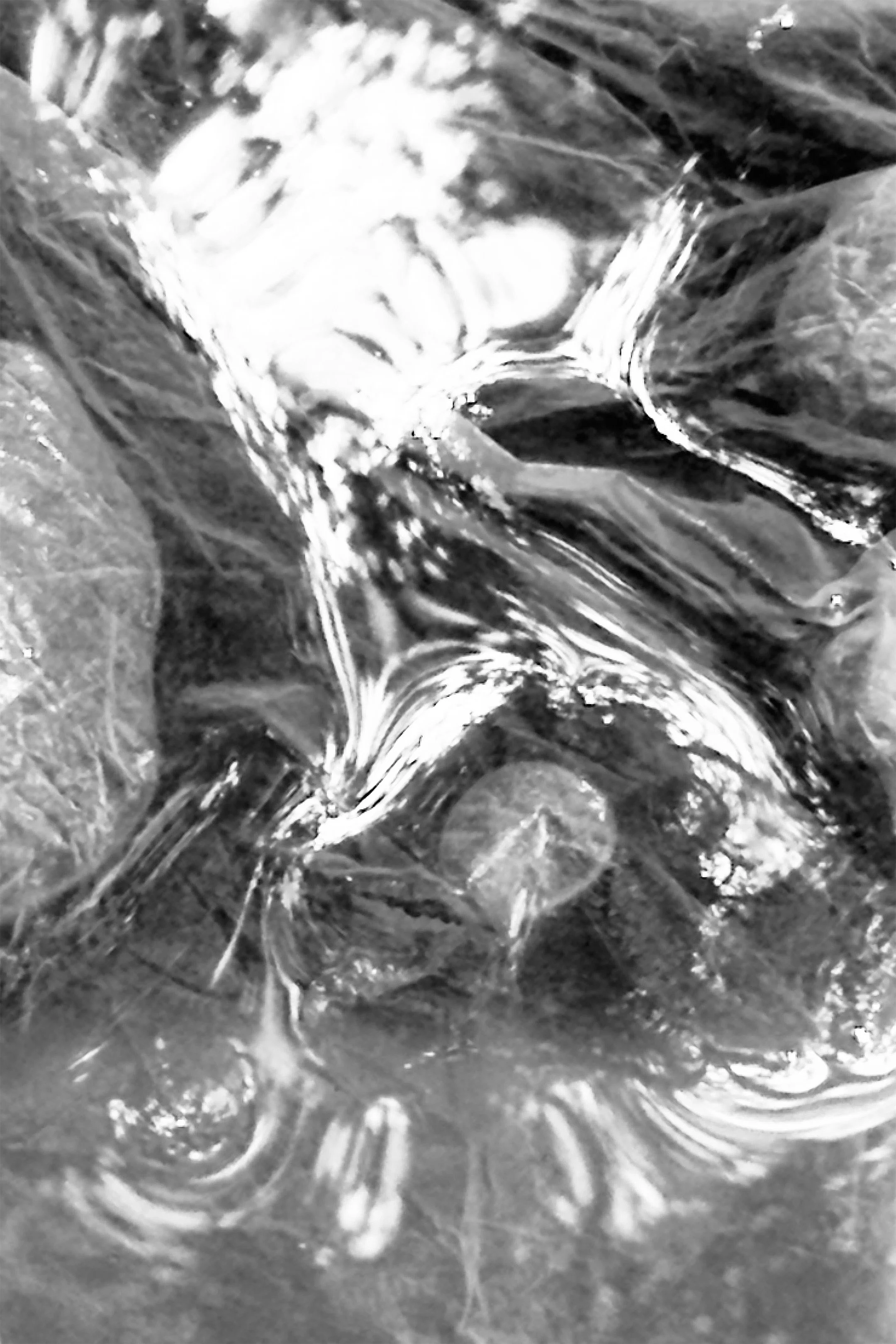 Vision of the trees above on the surface of the water. Light reflections bending around the air pockets still floating on the surface. Bubbles are trapped. Textures of a light dry paper surface collapsed into darkened translucent fabric. The textures of the moss, the dirt, and the river stones on the surface of the ground at the bottom of the stream.