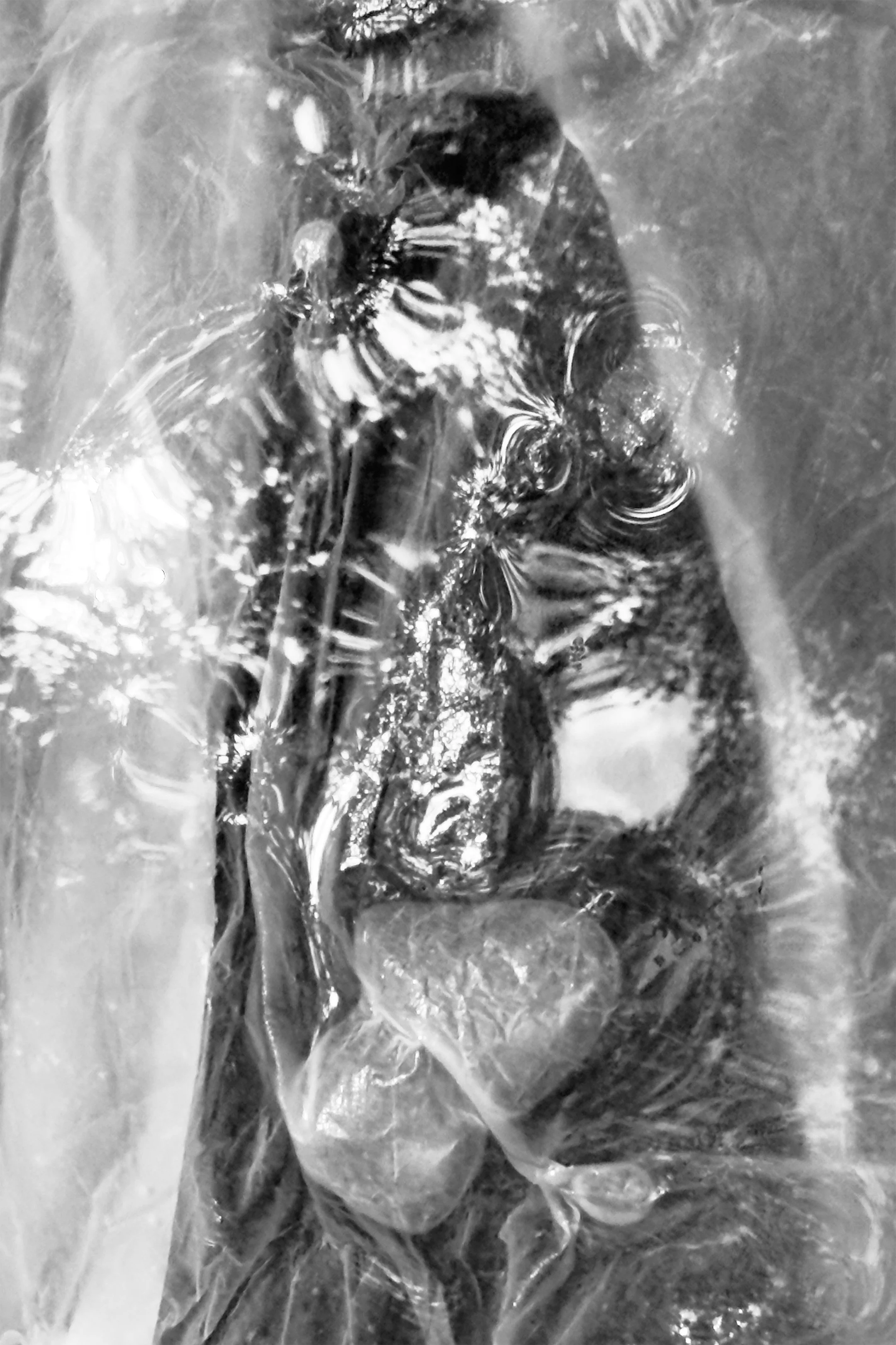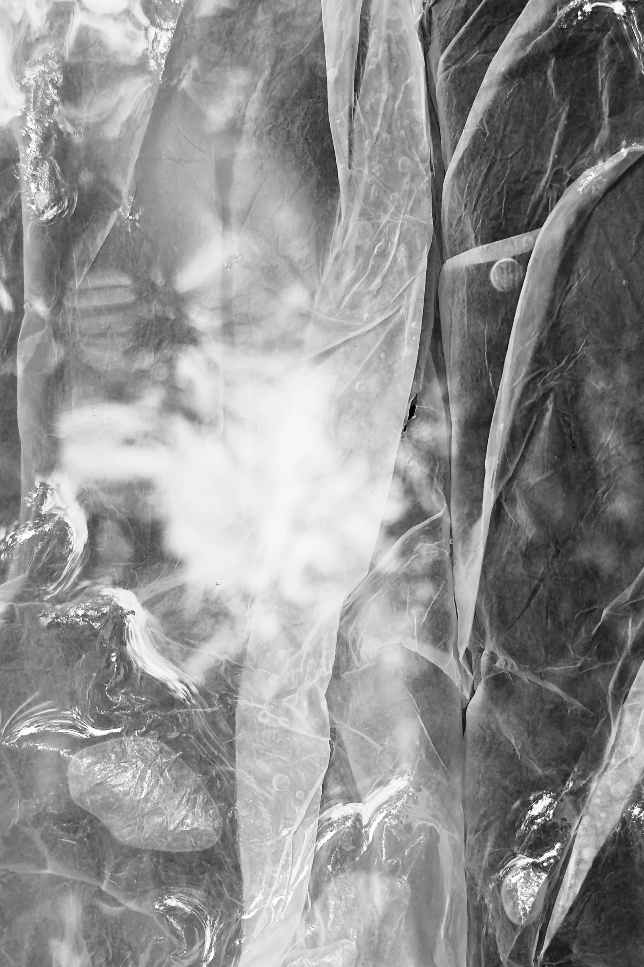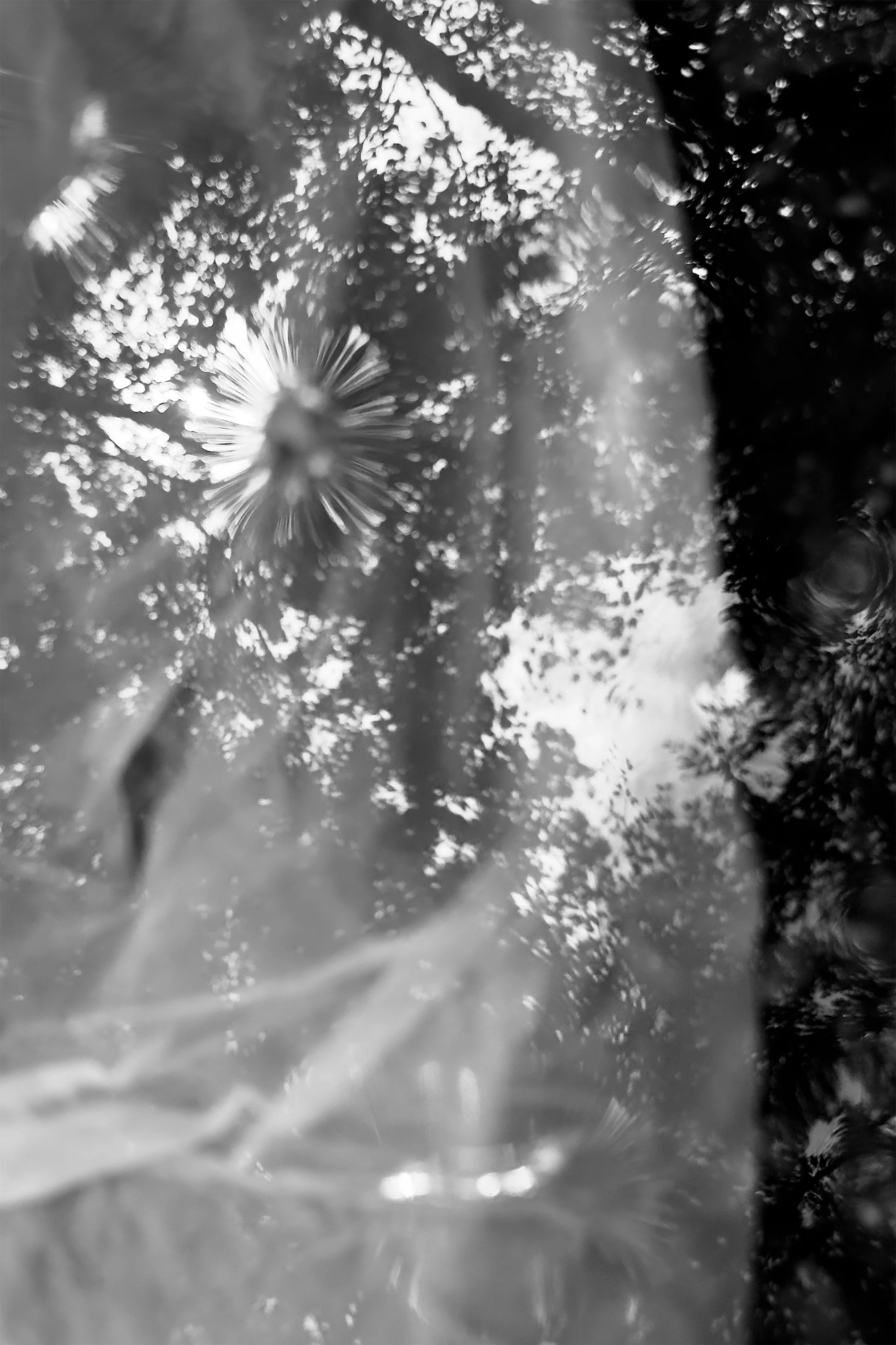 Vision of the trees above on the surface of the water. Light reflections bending around the air pockets still floating on the surface. Bubbles are trapped. Textures of a light dry paper surface collapsed into darkened translucent fabric. The textures of the moss, the dirt, and the river stones on the surface of the ground at the bottom of the stream.